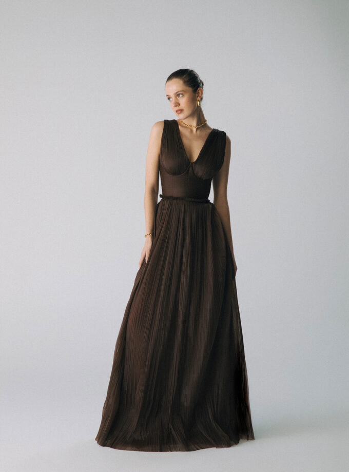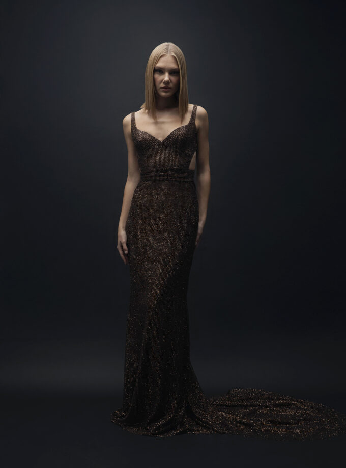 Fera – Kahverengi Pul İşlemeli Uzun Kuyruklu Elbise