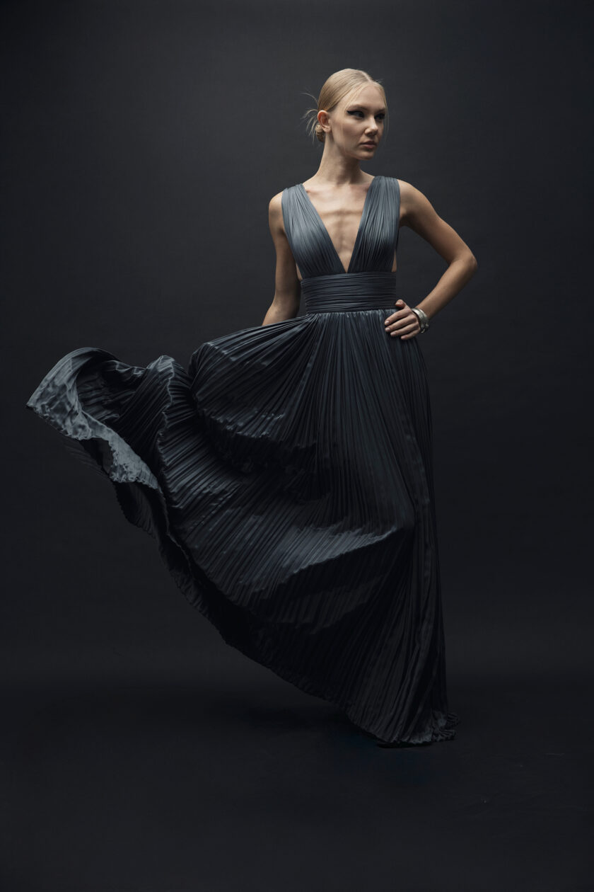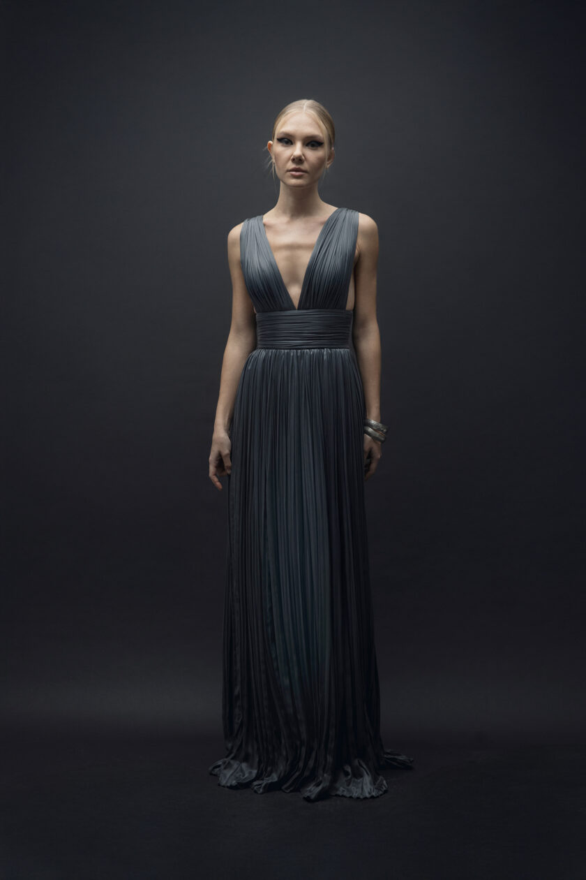 Bu zarif gri elbise, ipeğin yumuşak dokusu ile el işçiliğiyle oluşturulan drapelerin uyumunu mükemmel bir şekilde yansıtmaktadır. Akıcı ve dökümlü yapısı, hareket halindeyken göz alıcı bir zarafet sergilerken, derin V yaka detayı modern bir şıklık kazandırmaktadır.