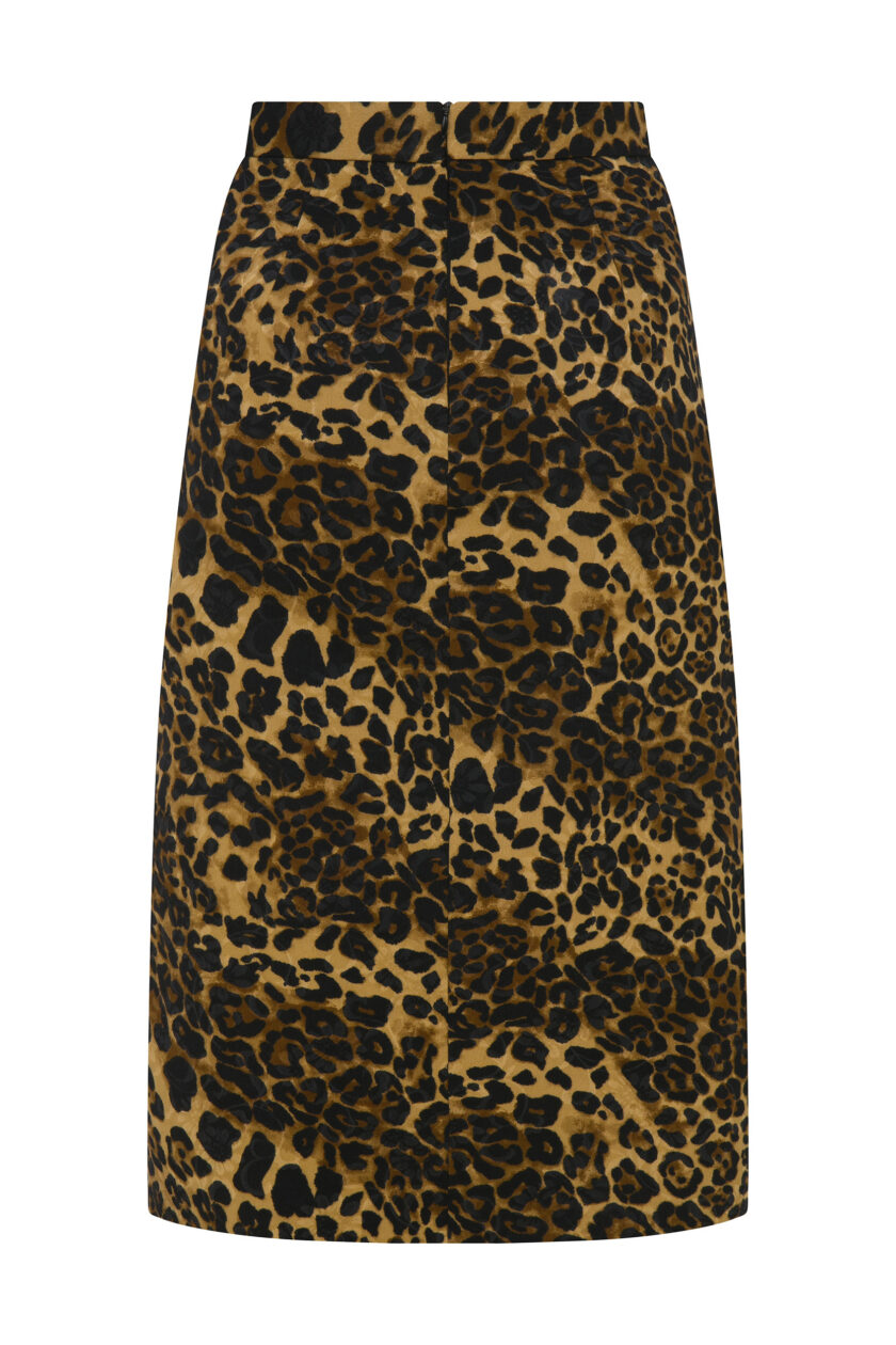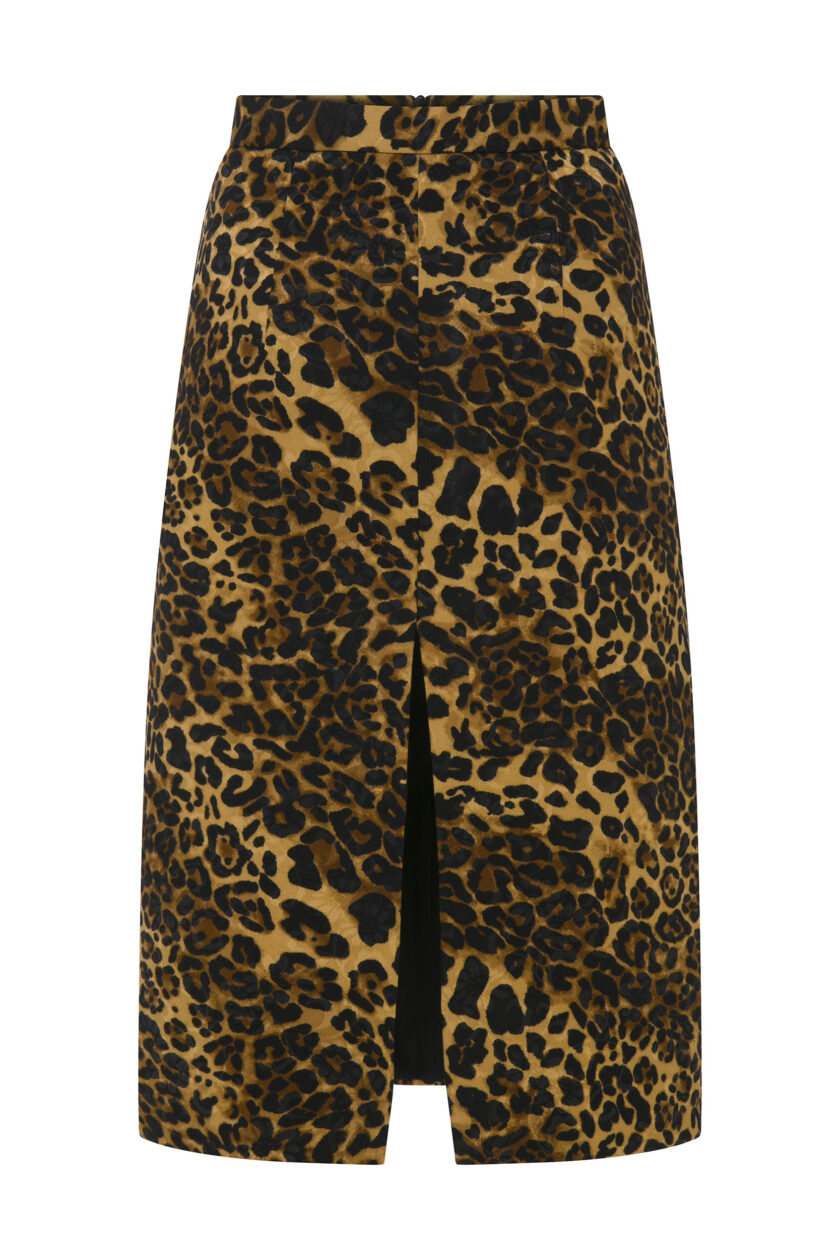 Leopar desenli midi, ön yırtmaç detaylı, cepli vücuda oturan kalem leopar desenli etek.