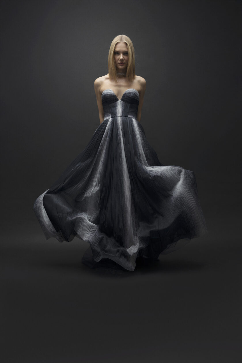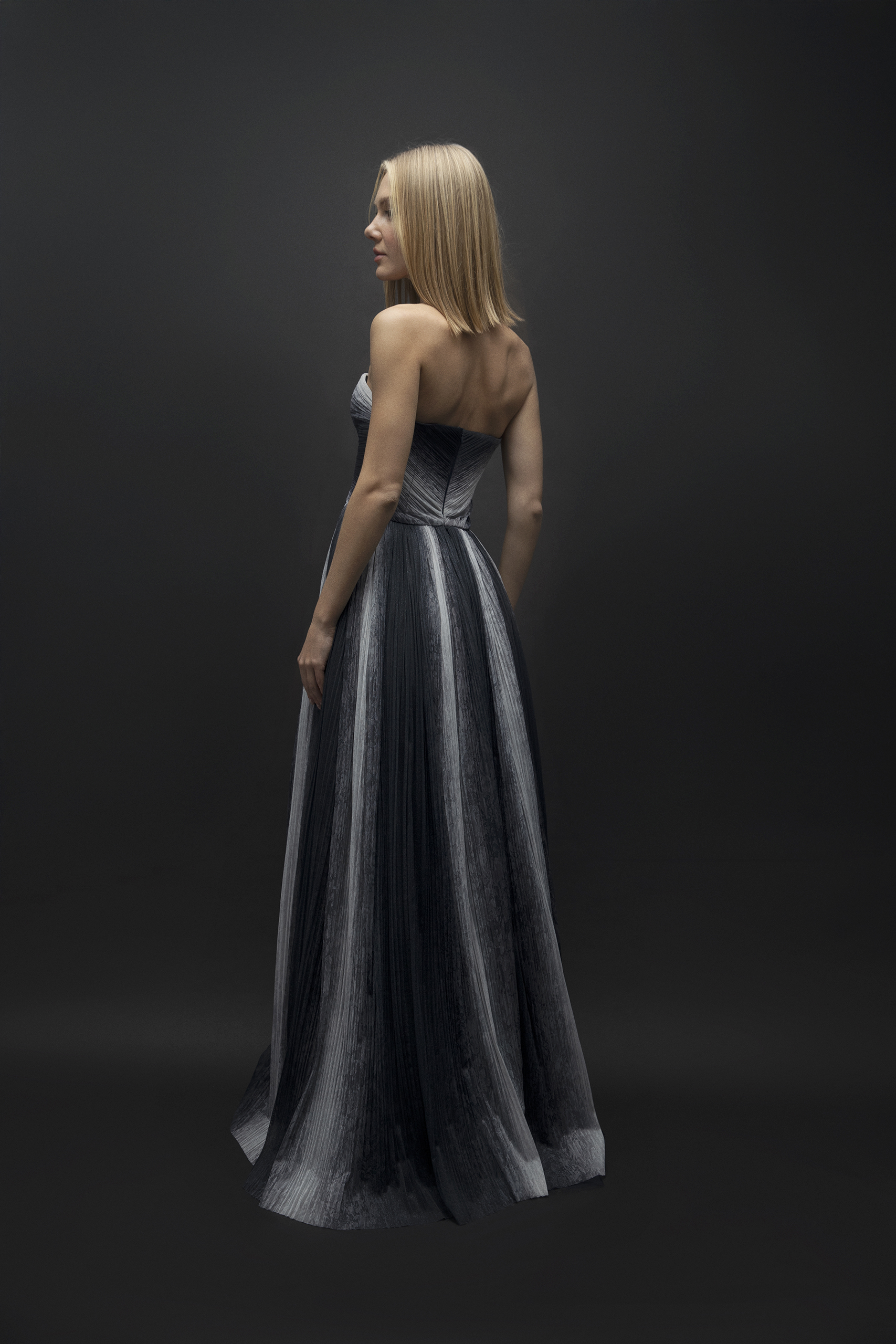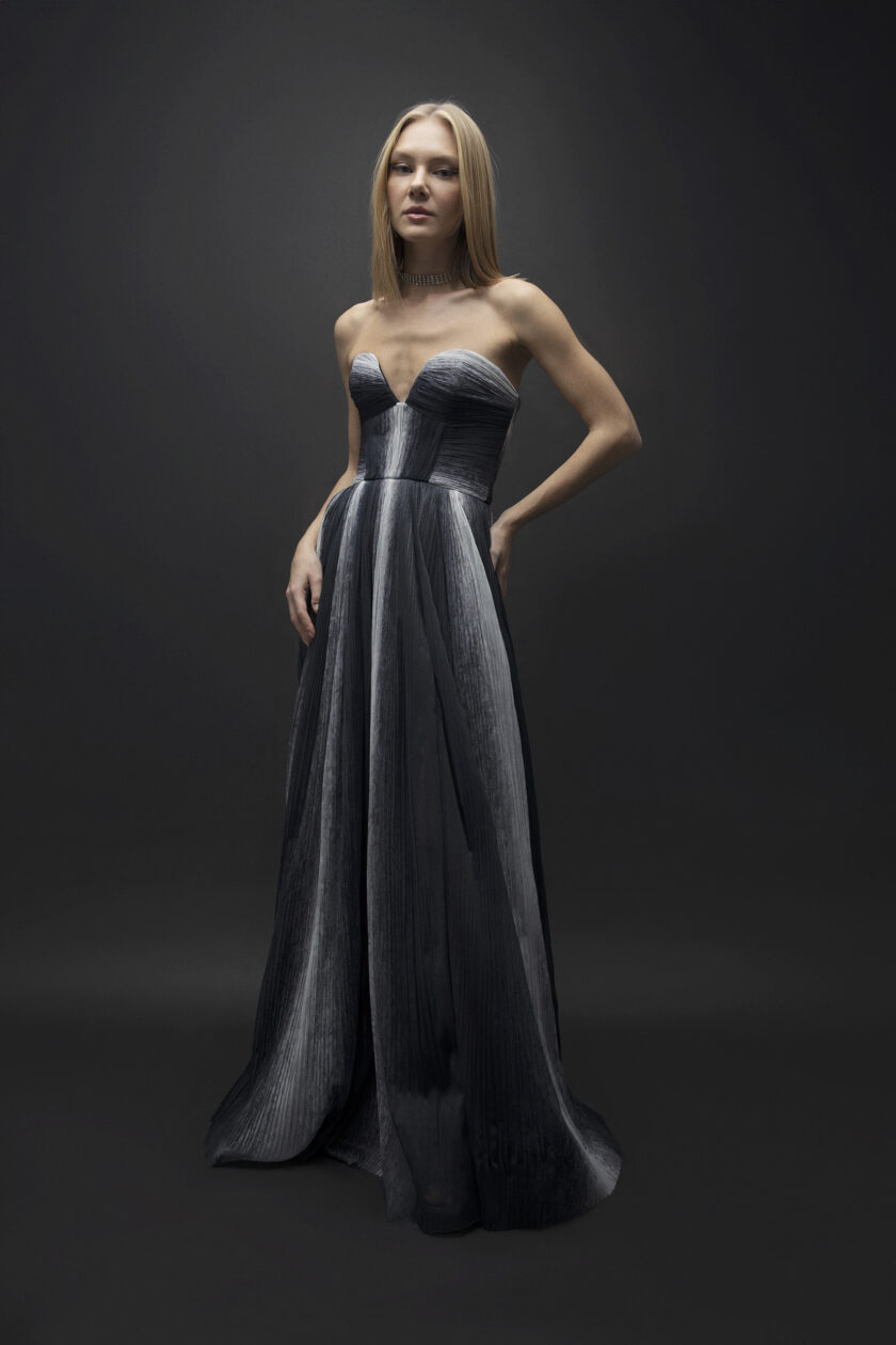 Modern tasarımı ve ustalıkla işlenen el drapesi detayları ile dikkat çekiyor. Straplez kesimi, vücuda kusursuz oturan korsajı ile feminen bir siluet oluştururken, akışkan kumaşın dökümlü yapısı her adımda büyüleyici bir hareket katıyor. Özel tekniklerle elde şekillendirilen drapeler, elbiseye derinlik ve dinamizm kazandırırken, güçlü ama romantik bir duruş yaratıyor.