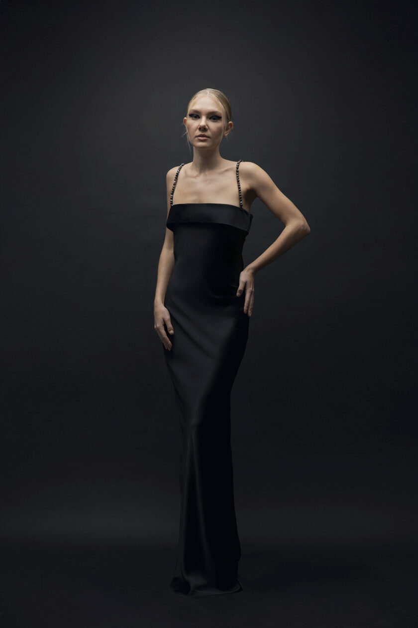Zarafetin en saf halini yansıtan bu siyah saten elbise, minimalist tasarımıyla sofistike bir duruş sergiliyor. Vücuda mükemmel uyum sağlayan silueti, lüks satenin akıcı dokusuyla buluşarak kusursuz bir şıklık sunuyor. Göğüs kısmındaki geniş bant detayı modern bir dokunuş katarken, elbiseyi özel kılan detay ise doğal taşlarla süslenmiş askıları.