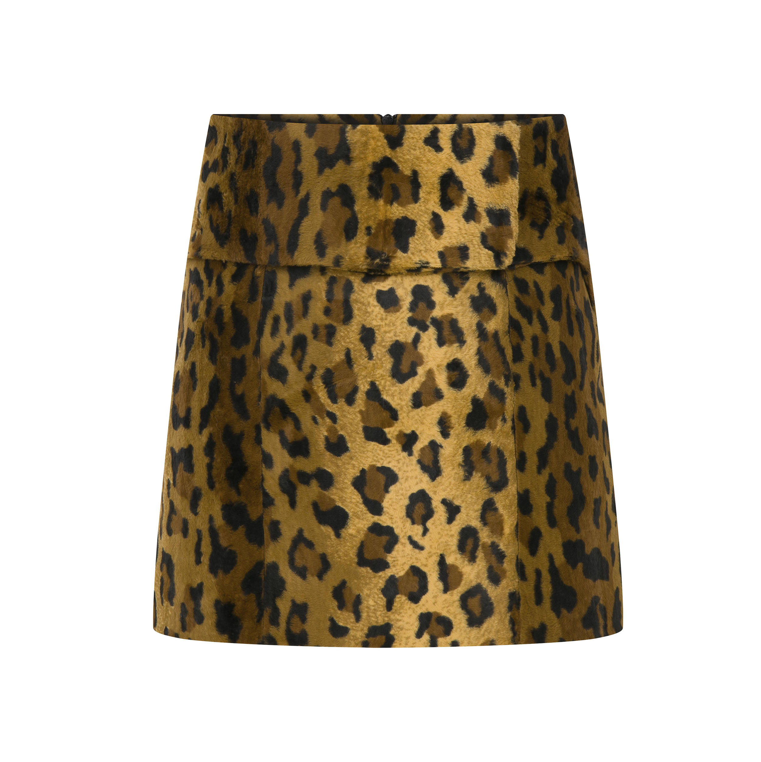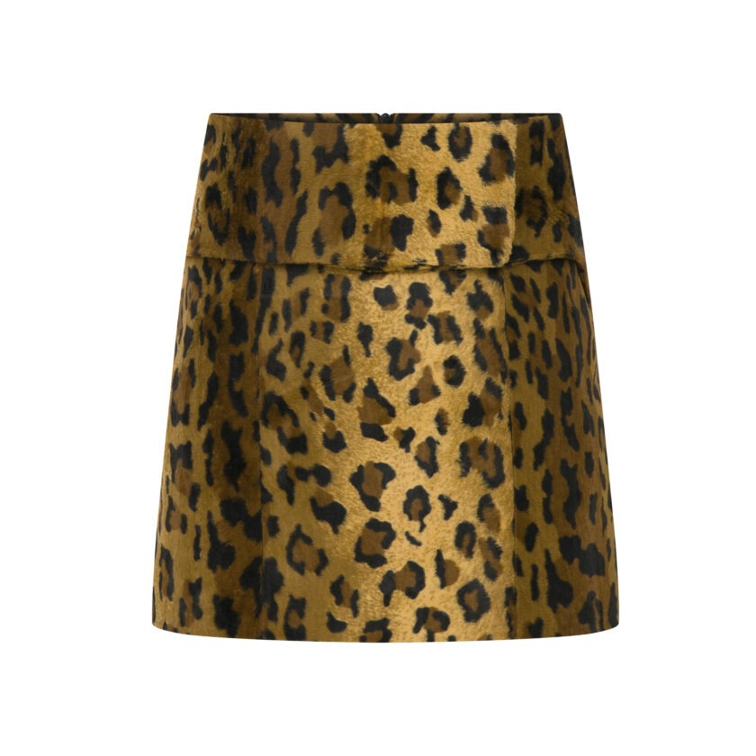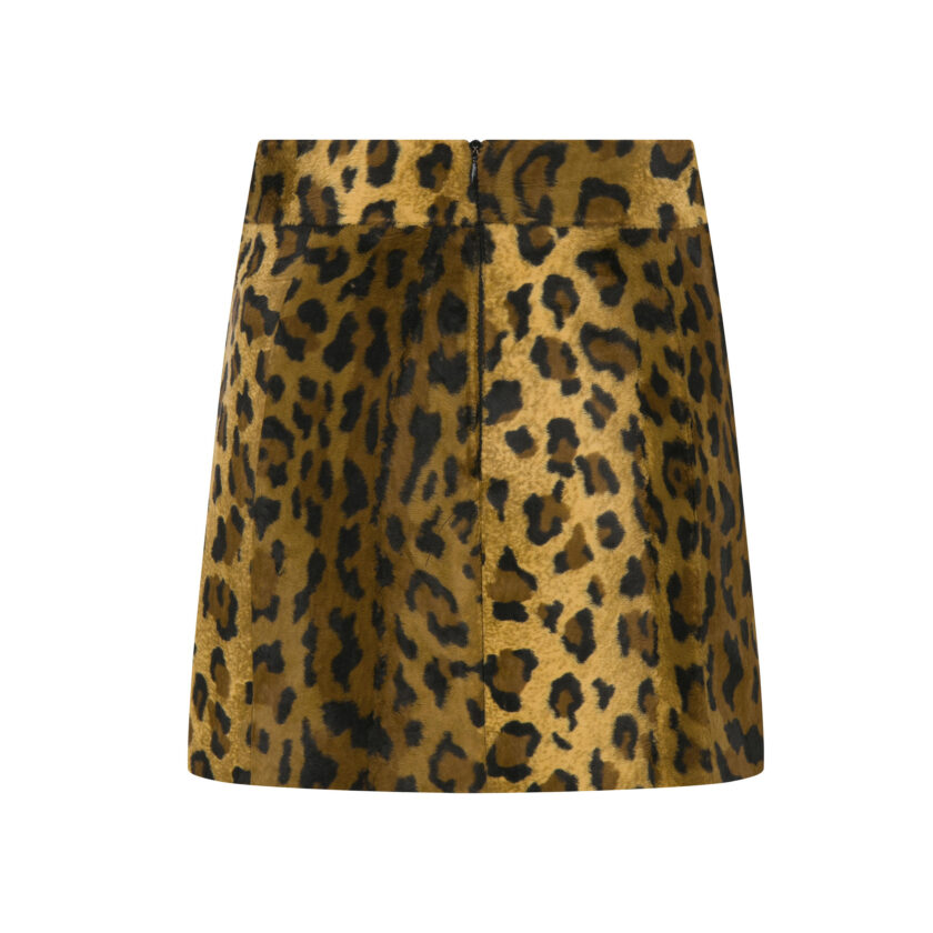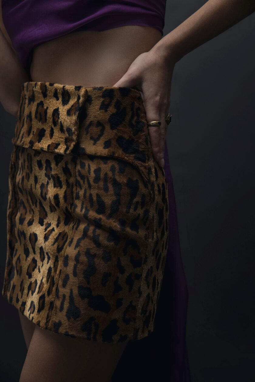 Leopar desenli mini etek, tasarımı ve vücuda oturan kesimiyle zarif bir görünüm sağlar.