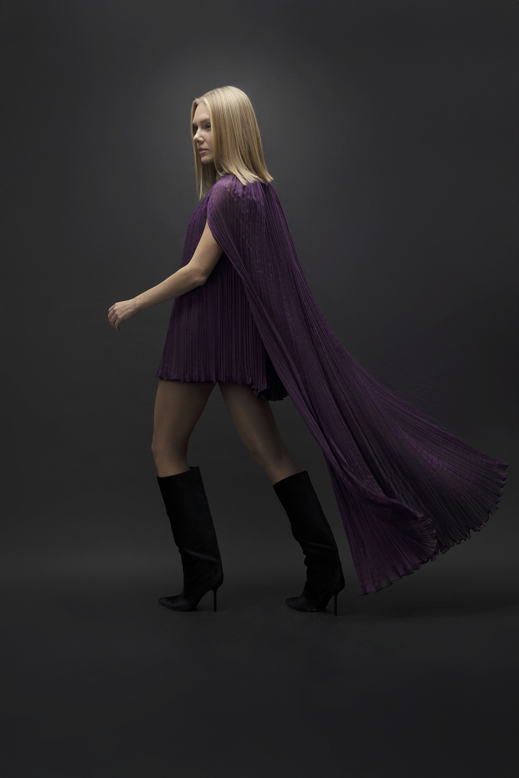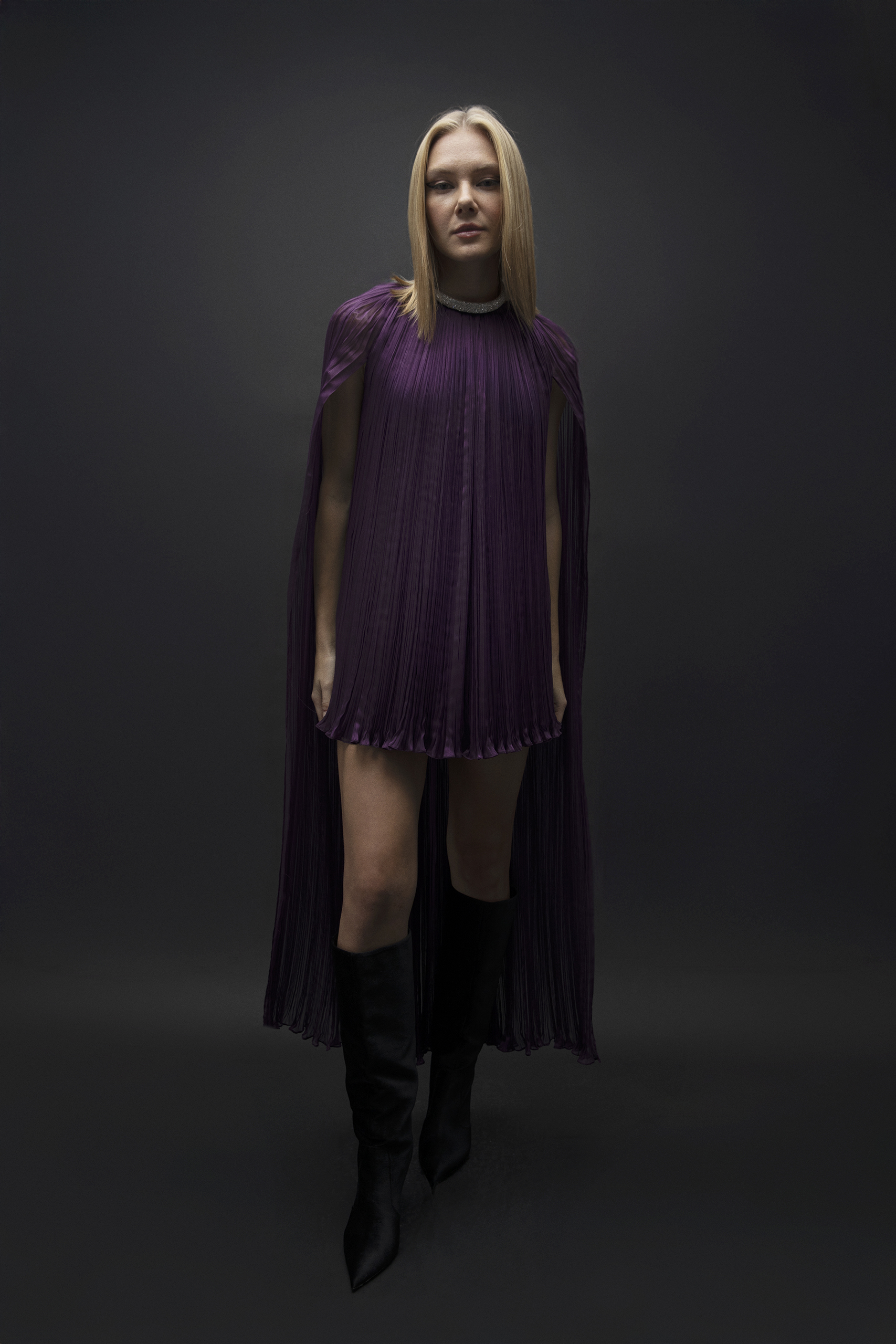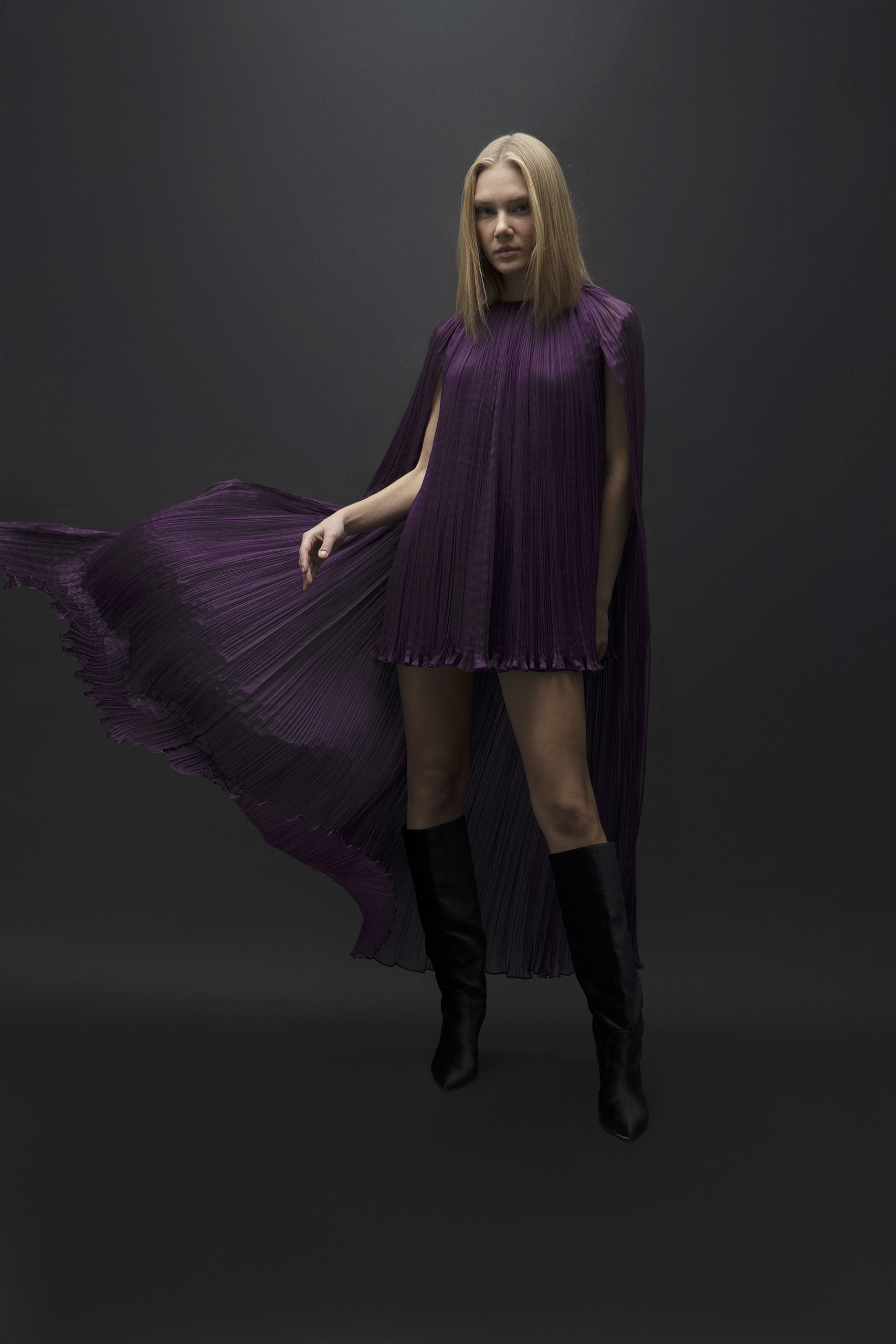 Hafif ve akışkan şifon dokusuyla hareket kazanan bu mini elbise, uzun pelerin el drapesi detayıyla sofistike bir duruş sergiliyor. Zarif plise dokusu ve derin mor tonu, modern ve etkileyici bir siluet yaratırken, her adımda özgün ve güçlü bir stil sunuyor.