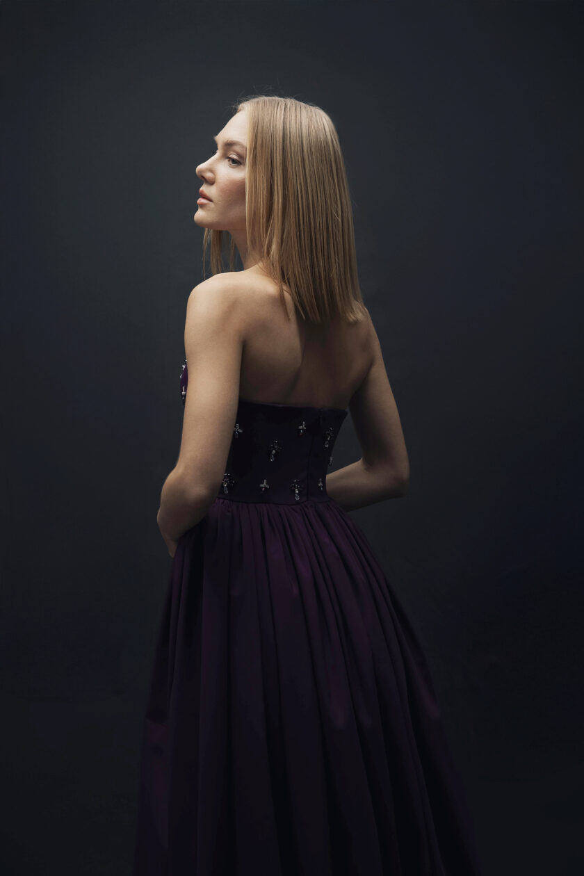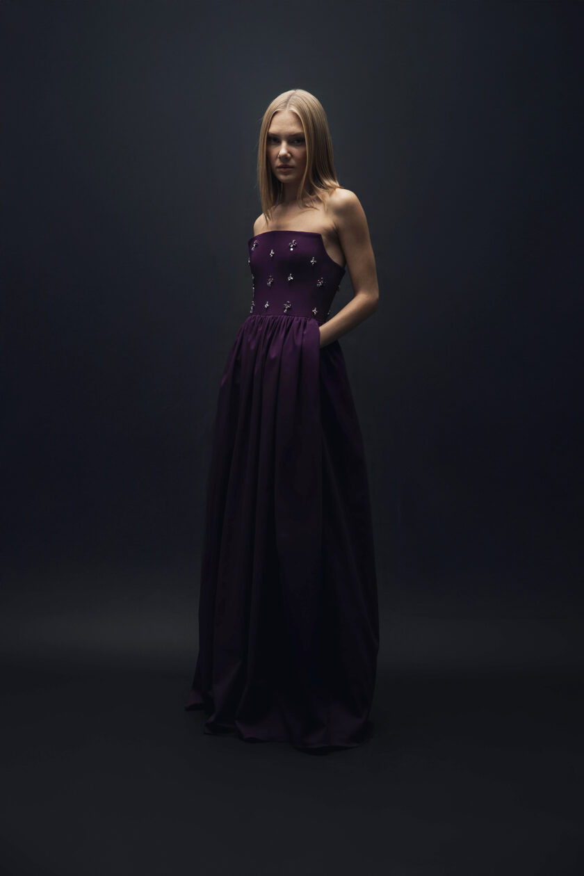 Göz alıcı mor rengi ve zarif taş işlemeleriyle öne çıkan, cep detaylı , beli büzgülü straplez elbise.