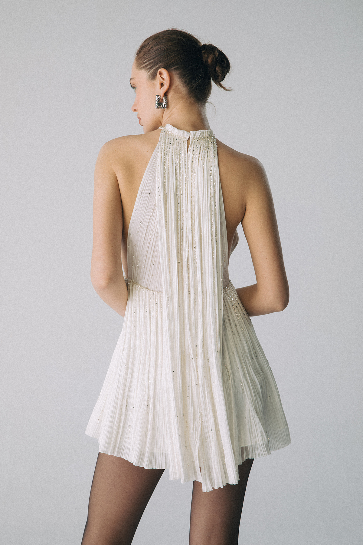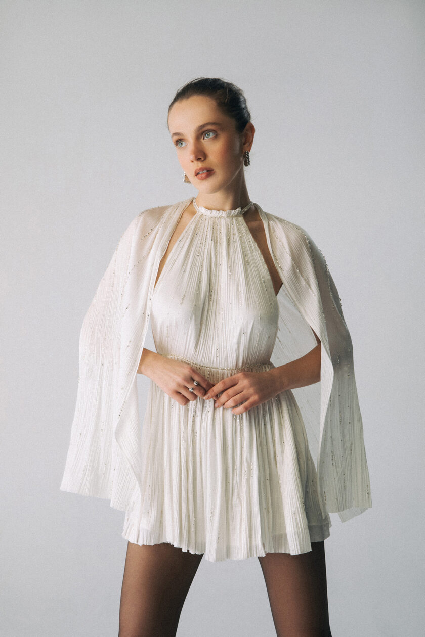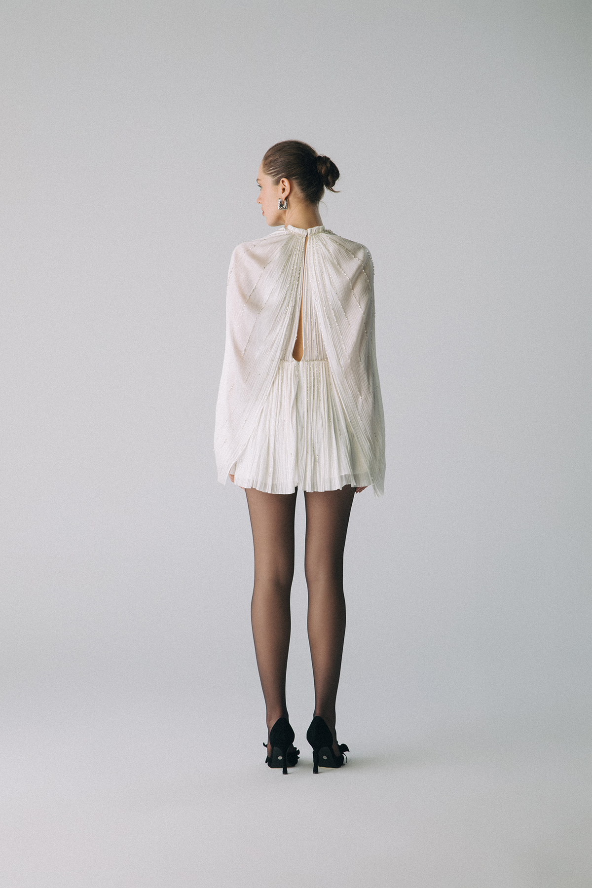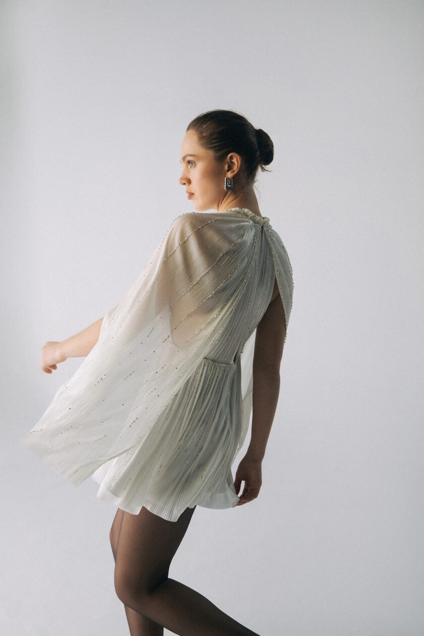 ZURIA – Boyundan Bağlamalı Pelerin Detaylı Kristal Taş İşlemeli İpek Elbise